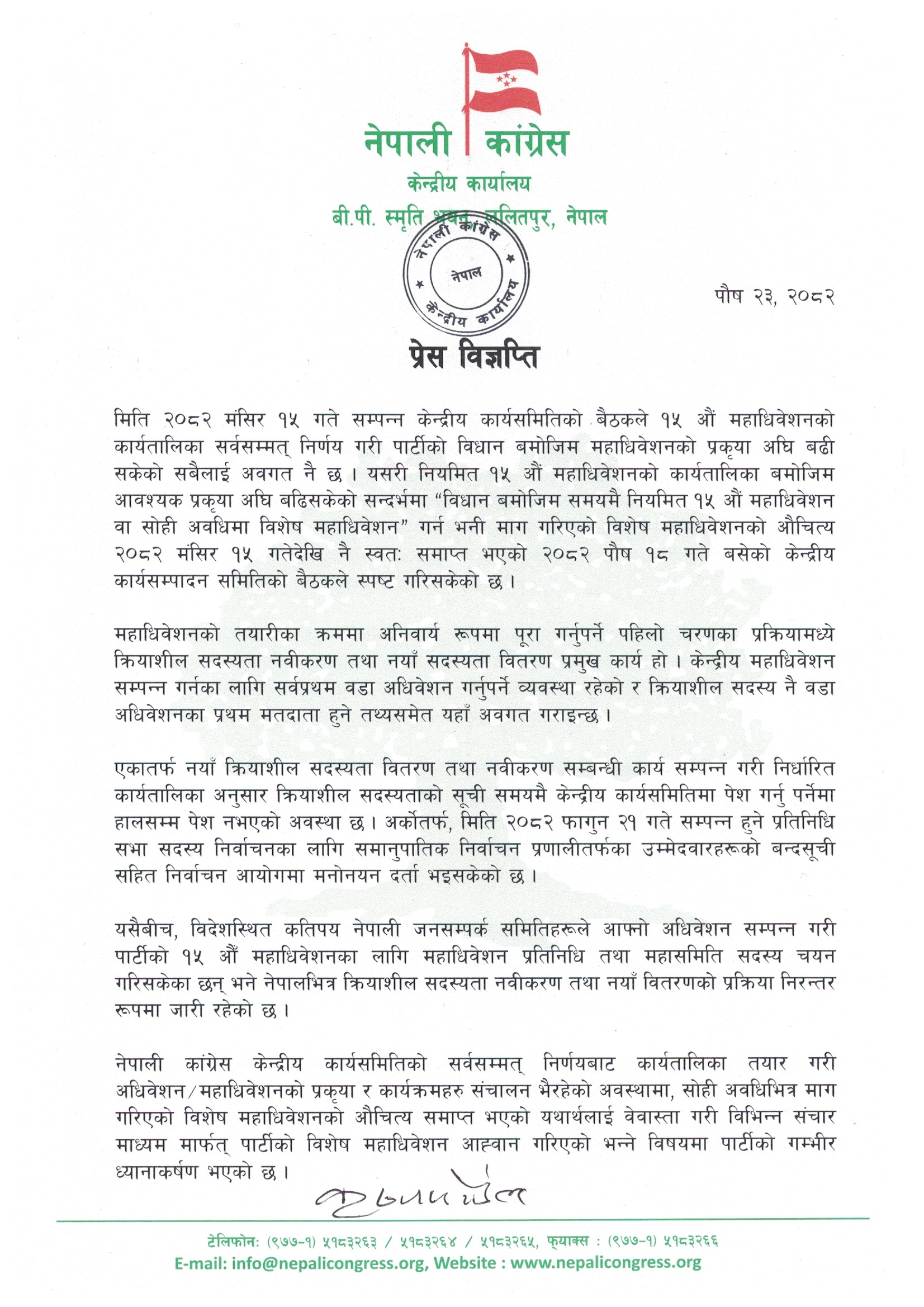 घटनाक्रमकै बीच सभापति देउवाले पार्टी कार्यालयका मुख्यसचिवमार्फत विज्ञप्ति निकाल्दै विशेष महाधिवेशन रोक्न चेतावनी दिएका छन्। विज्ञप्तिमा महामन्त्रीलाई विशेष महाधिवेशन आह्वान गर्ने अधिकार नभएको उल्लेख छ।
