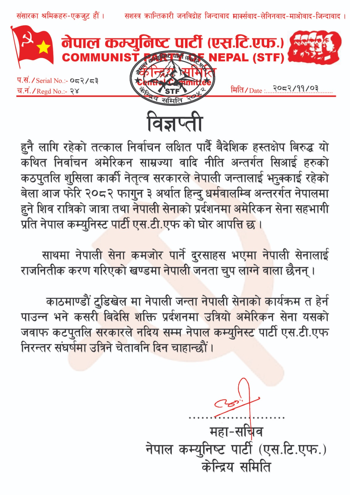 काठमाडौं । नेपाल कम्युनिस्ट पार्टी (एस.टि.एफ.) ले नेपालमा हुन लागेको शिवरात्रि जात्रा तथा नेपाली सेनाको प्रदर्शन कार्यक्रममा अमेरिकी सेना सहभागी हुने विषयप्रति कडा आपत्ति जनाएको छ।