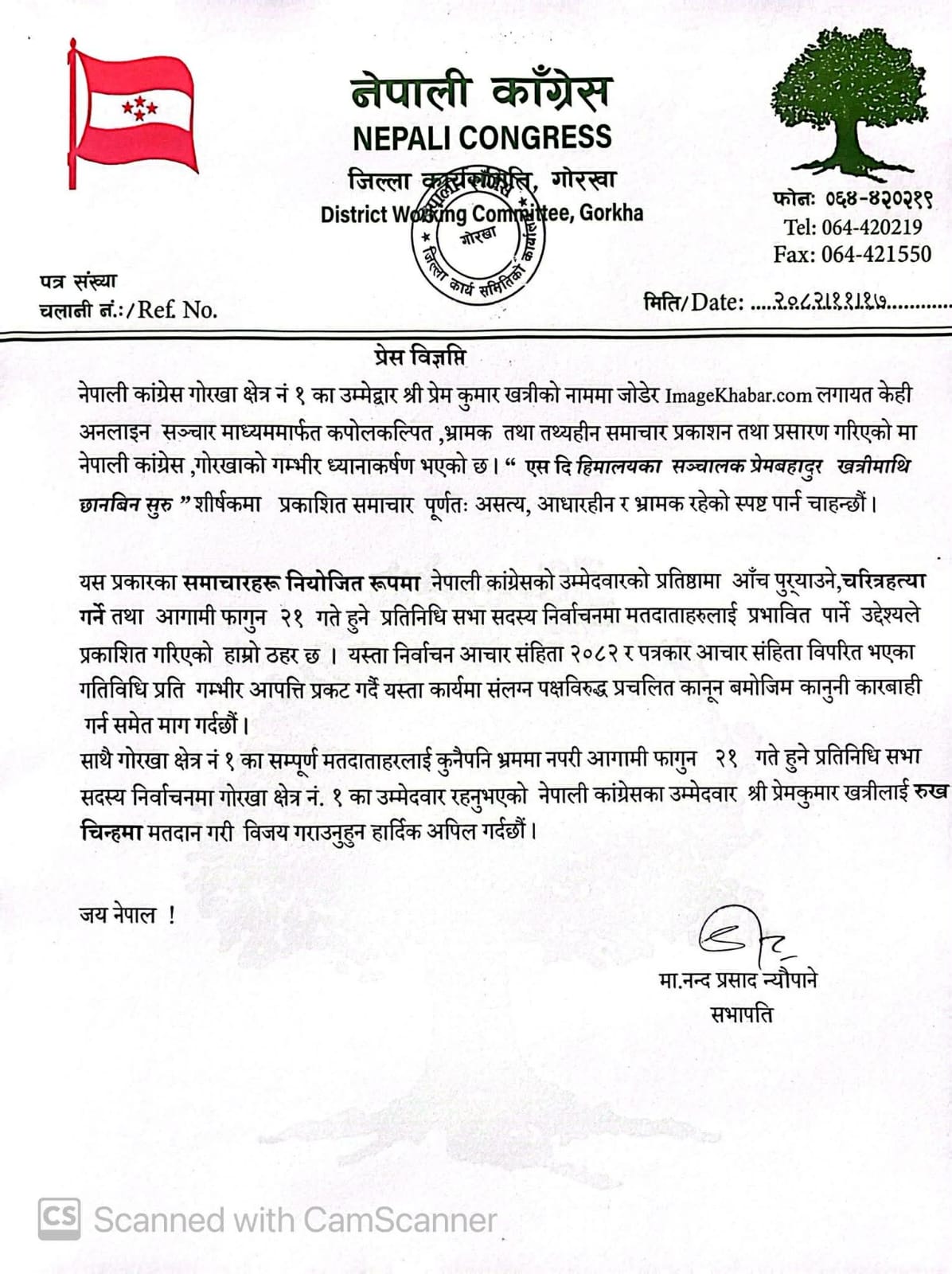 उक्त विज्ञप्ति नेपाली कांग्रेस गोरखाका सभापति माननिय नन्द प्रसाद न्यौपानेद्वारा जारी गरिएको हो।
